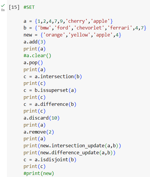 add(): Adds an element to the set.clear(): Removes all elements from the set.pop(): Removes and returns a random element.intersection(): Returns elements common to both sets.issuperset(): Checks if a set contains all elements of another set.difference(): Returns elements in one set but not in the other.discard(): Removes a specified element without error if the element is not found.remove(): Removes a specified element and raises an error if the element is not found.difference_update(): Removes elements found in another set from the original set.intersection_update(): Updates the set with elements common to both sets.is_disjoint(): Checks if two sets have no elements in common.- Cannot add two sets: Sets do not support the